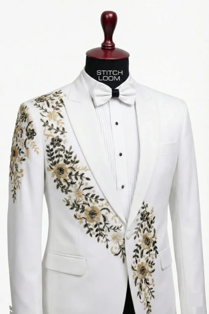 The blazer is crafted using premium suiting fabric that offers a clean structure, smooth texture, and long-wear comfort suitable for Indian climatic conditions. The fabric supports sharp tailoring while maintaining durability during extended use. The design highlight is the intricate floral embroidery running across the shoulder and front panel, creating a balanced contrast against the white base while preserving a refined silhouette.